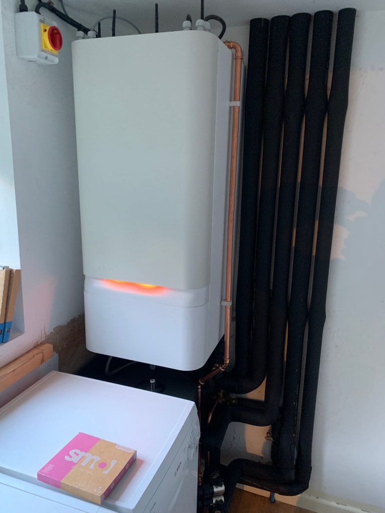 lots of parking around the corner on Bar lane. About half the indoor pipework and buffer tank is mostly obscured by a worktop.
