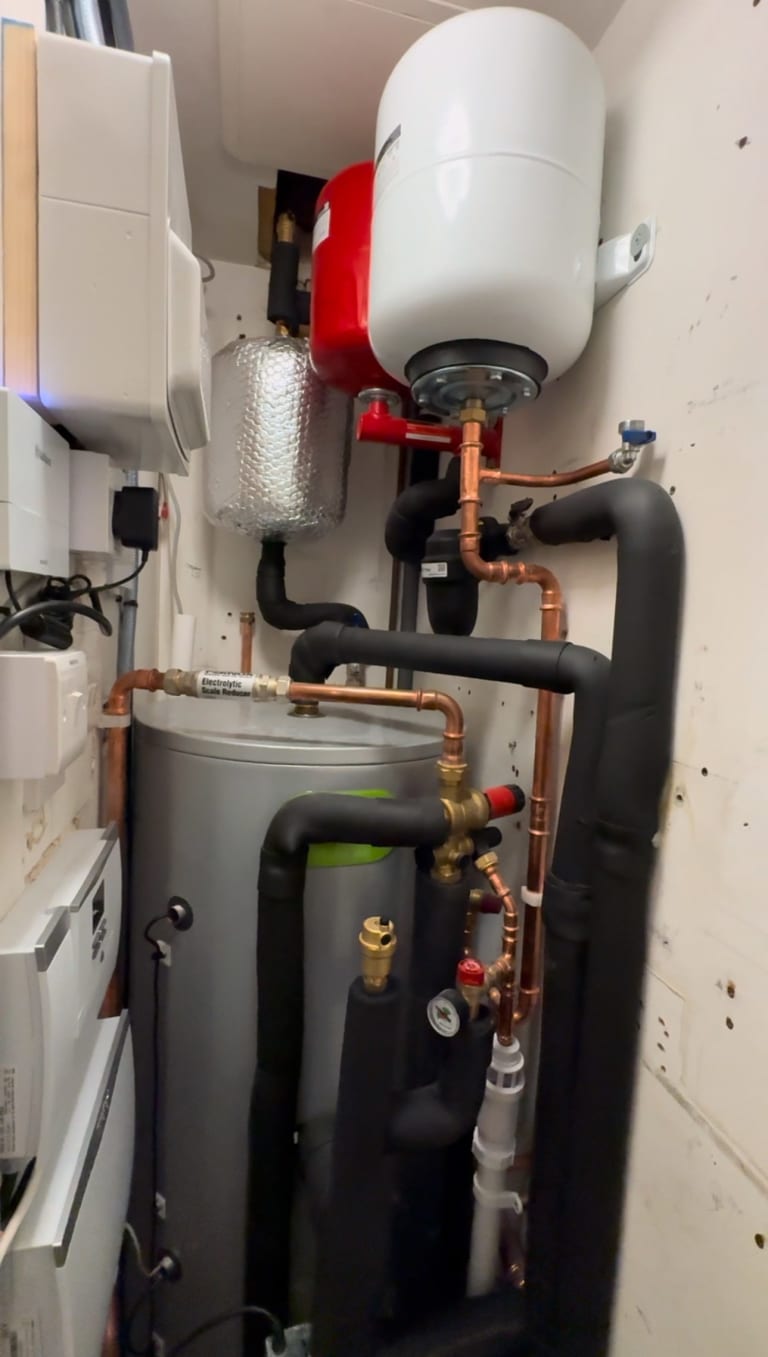 After much research in 2022 - 23, we opted for a Vaillant aroTHERM plus install by AIRA in October 2023. The install included a completely new heating system, with 9 correctly sized radiators throughout the property, a new slightly larger Hot Water tank (replacing the 2004 model), new zone valves and pumps, along with two expansion vesicles and a very small buffer header tank. We also opted to have two zones installed; one for the underfloor heating and one for the radiators. This does slightly effect the potential Coefficient of Performance of the system, but we requested this to unable improved control of the temperature within the house, where we opt to heat the home primarily via the underfloor heating, and only occasionally use the radiator zone for the 1st and 2nd floor of the Mews house property.