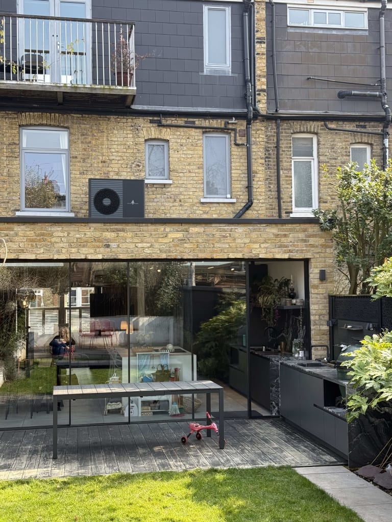- Heat Pump hanging on the wall above the flat roof of our extension